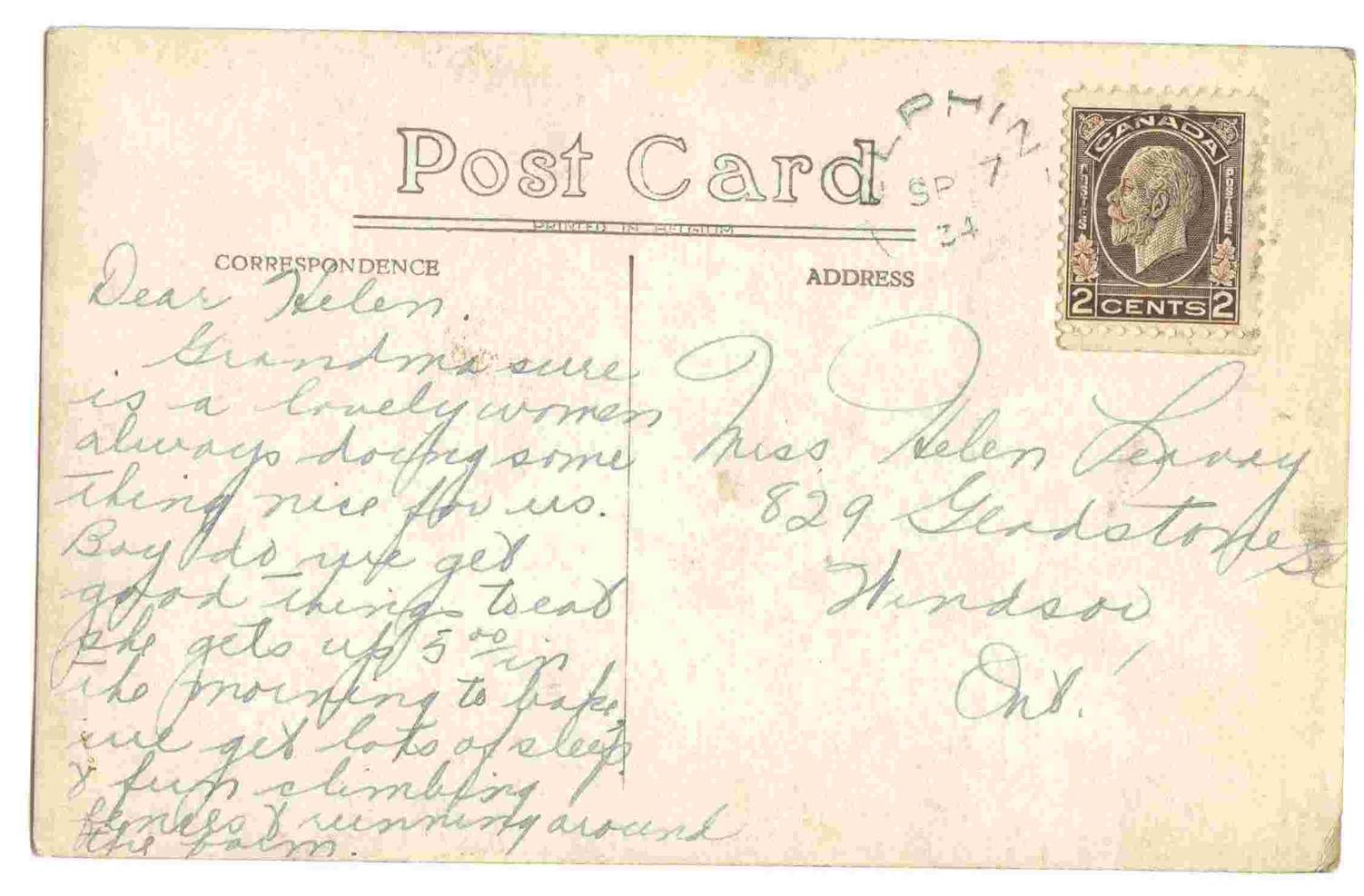 The postcard is written by 19 year old Cynthia Bea Leavoy to her younger sister Helen (age 13 at the time). Robert Kennedy and Minnie (his second wife) would have owned the farm. They were the grandparents of Cynthia Bea and Helen.