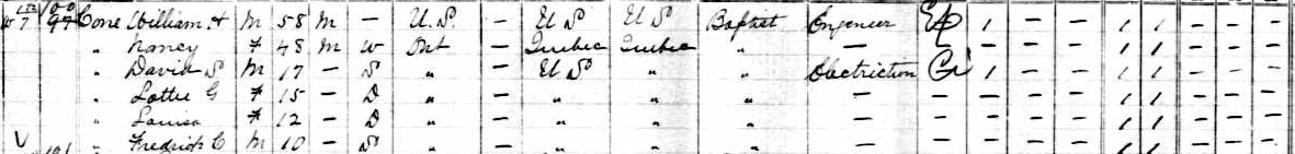 By 1881, all but one of Nancy‘s siblings (the exception is the youngest, Amey) had moved out of her parent’s home two doors down, and her own family had burgeoned to 10 people. Four more children were added to the mix: David Saunders (8), Charlotte “Lottie” Grace (5), Harriet Louisa (2) and baby Frederick (10 months). Annie Cone, who would be 23 years old, no longer lived at home. The eldest, Alfred (20), helped out with the cost of living by working as a labourer, possibly alongside his grandfather Achan.