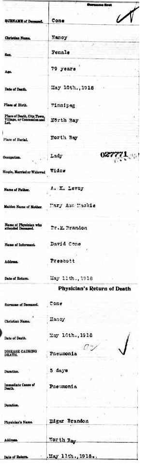 William Henry Cone died at age 77 on March 27, 1908 of dementia. Nancy would have helped to care for him during his 3 month illness. I have found evidence that she lived with her daughter Charlotte and her family in Winnipeg where they moved with George Campbell’s work. Incidentally, Louisa and Walter Evans also lived in Manitoba at the time, so it appears that the family tried where they could to stick together. Frederick Cone stayed in Nipissing and his mother Nancy finally rejoined him sometime before her death in 1918. He married a woman called Norah James 8 years later.