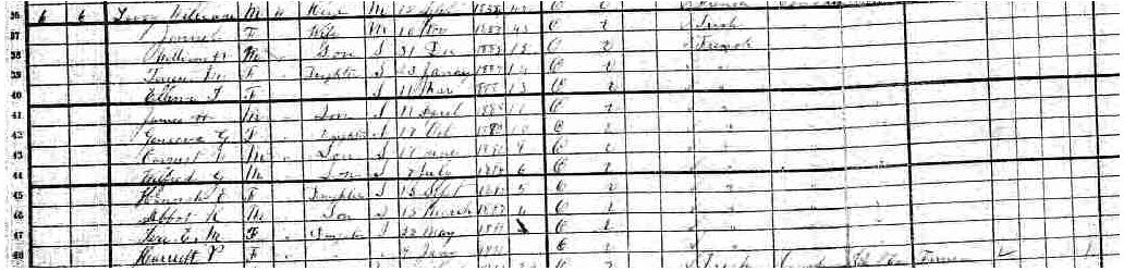 This couple had fourteen children together between 1883 and 1908. The first two children died as infants (the 12 surviving children were: William A., Teresa, Ellen J., James H., Geneve, Ernest W., Wilfred Garnet, Hannah, Abbott Raymond, Iva E., Kenneth P., Maurice) and one can imagine that the first few years of their marriage would have been difficult in light of this. It isn’t surprising to see that the couple was documented as being particularly religious  on the following census.