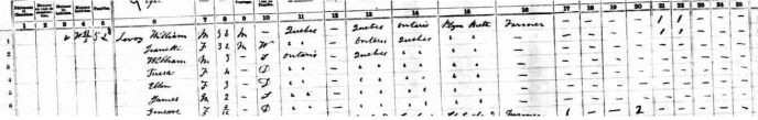 Ten years later the Leavoy clan still resided in the North Hastings area, but had grown considerably as would be expected of a farming family. The couple now lived with their eleven children ranging from infancy to mid teens. Eldest son, William jr.(15) attends school for 4 months a year, and likely helped his father, uncle James and grandfather Achan who were now all neighbours. Teresa (14) and Ellen (13) also attend school for 4 months. Younger brother James (11) only attends for 1 month and Genevieve (10) doesn’t go at all.