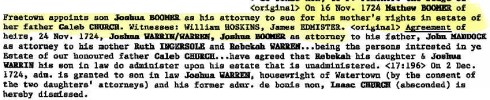 There is record later of Matthew Jr. attempting to gain land from Hannah’s father through the court. In the record from 1724 (below), his son Joshua acts as his attorney. Caleb Church, as we know was a wealthy landowner, and it appears (to no surprise) that he likely did not favor the Boomers.