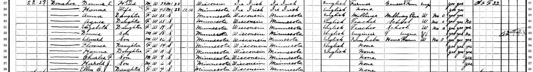 Edward looks to have been the 5th in a family of 10 children to parents Dennis Edward Donahue and Hannah Sullivan, although the 1910 federal census reveals that there were originally 12 (2 had died). There was the first child, Anna E. (born in 1888), the second, Agnes (1889), the third was Elizabeth (1890), the fourth was Dennis Jr.(1892), then Edward, and Florance (1895), Hannah (1899), Charles Francis (1901), Harold J. (1904), and finally the youngest, Ellen C. (1906). All were born in Minnesota and lived the life of a farming family where their grandparents from both sides also owned acreage nearby.